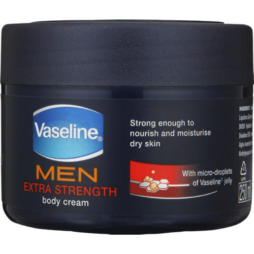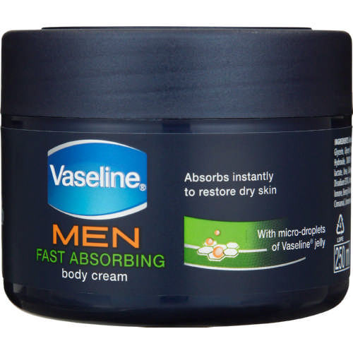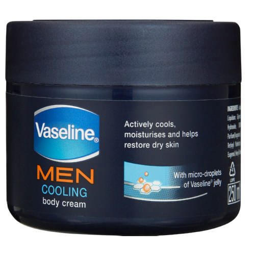 aseline Men Body Cream Cooling 250ml Vaseline Men Cooling Body Cream 250 ml absorbs deeply into skin to moisturise it from within – it does this thanks to micro-droplets of Vaseline jelly suspended in its formula. Added menthol provides a cooling sensation as well as deep moisture to restore dry skin.